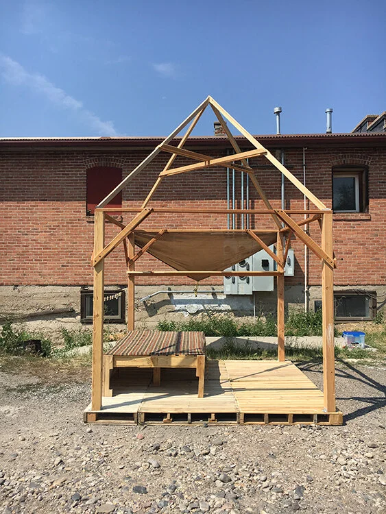 A tiny home structure made out of pallets and found wood. This project, commissioned by the Bozeman Art District and Echo Arts Gallery, was designed to be an “obstacle” in a running race meant to raise money and connect people to generate solutions for affordable housing. People gathered, created artwork, decorated the house, and quickly transformed it into a home. They left messages for each other and discussed the affordable housing crisis in Bozeman.